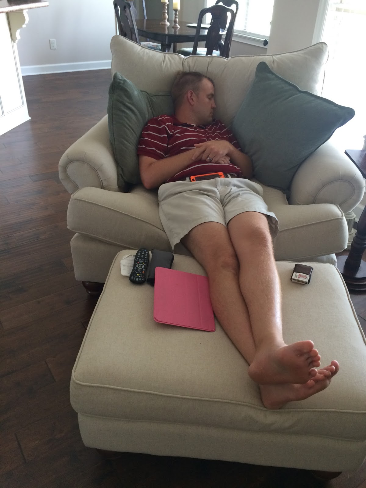 The day after. He was so tired that this is what he did after lunch yesterday. And who naps in nice clothes? As soon as we came in from church, I immediately put on a t-shirt and Nike running shorts. Dustin puts on this. ๐