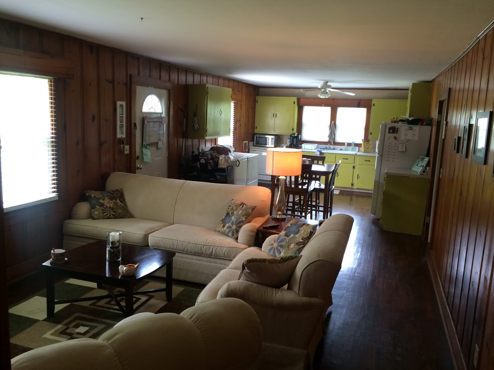 This is what you see as soon as you step through the front door. The house they are renting was built in the 1950s and this entire room has the real wood paneling.