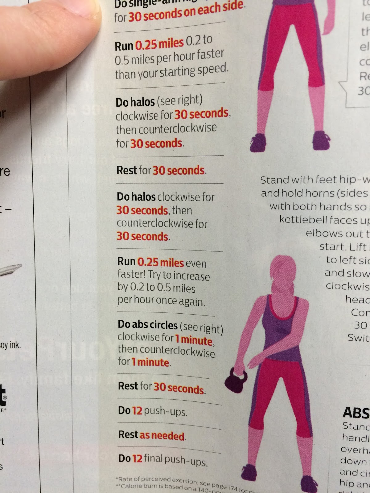 This was in one of my Shape magazines and I change up the weight part every now and then. You can customize it to fit you! I keep the 5 minute jog and running for .25miles unchanged.