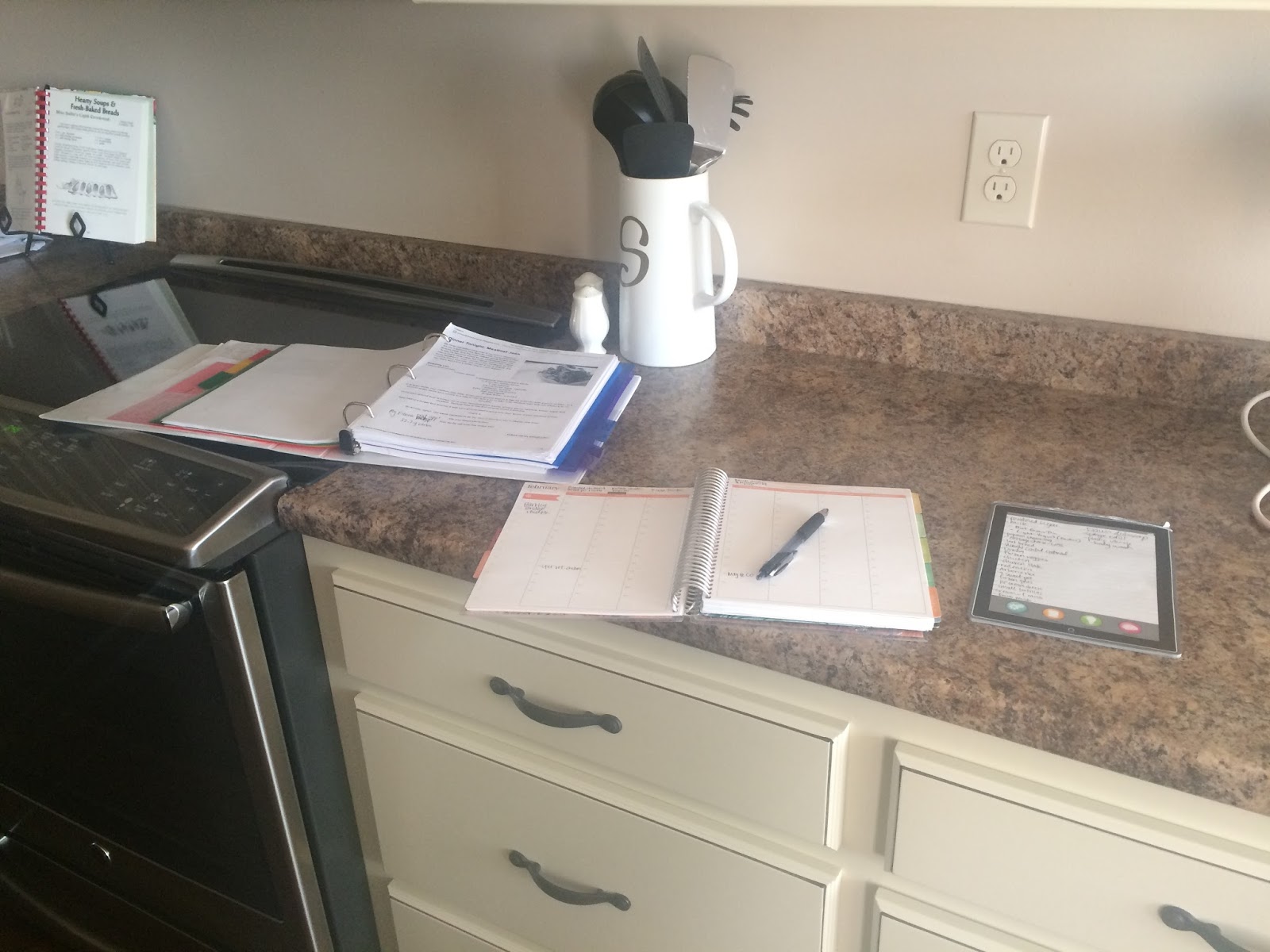 I use these three things each time I meal plan (plus cookbooks–not pictured). I have a binder where I keep a lot of my recipes in, my planner where I write down what meal goes with what day, and my grocery list pad.