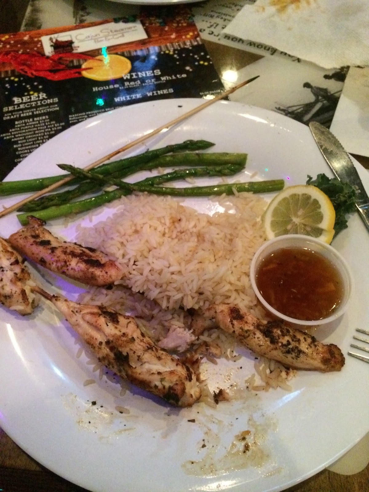 I forgot to take a picture of my plated meal, but here’s after I started eating. I got Caribbean Jerk Chicken with grilled asparagus–pretty good but way too spicy for my stomach!
