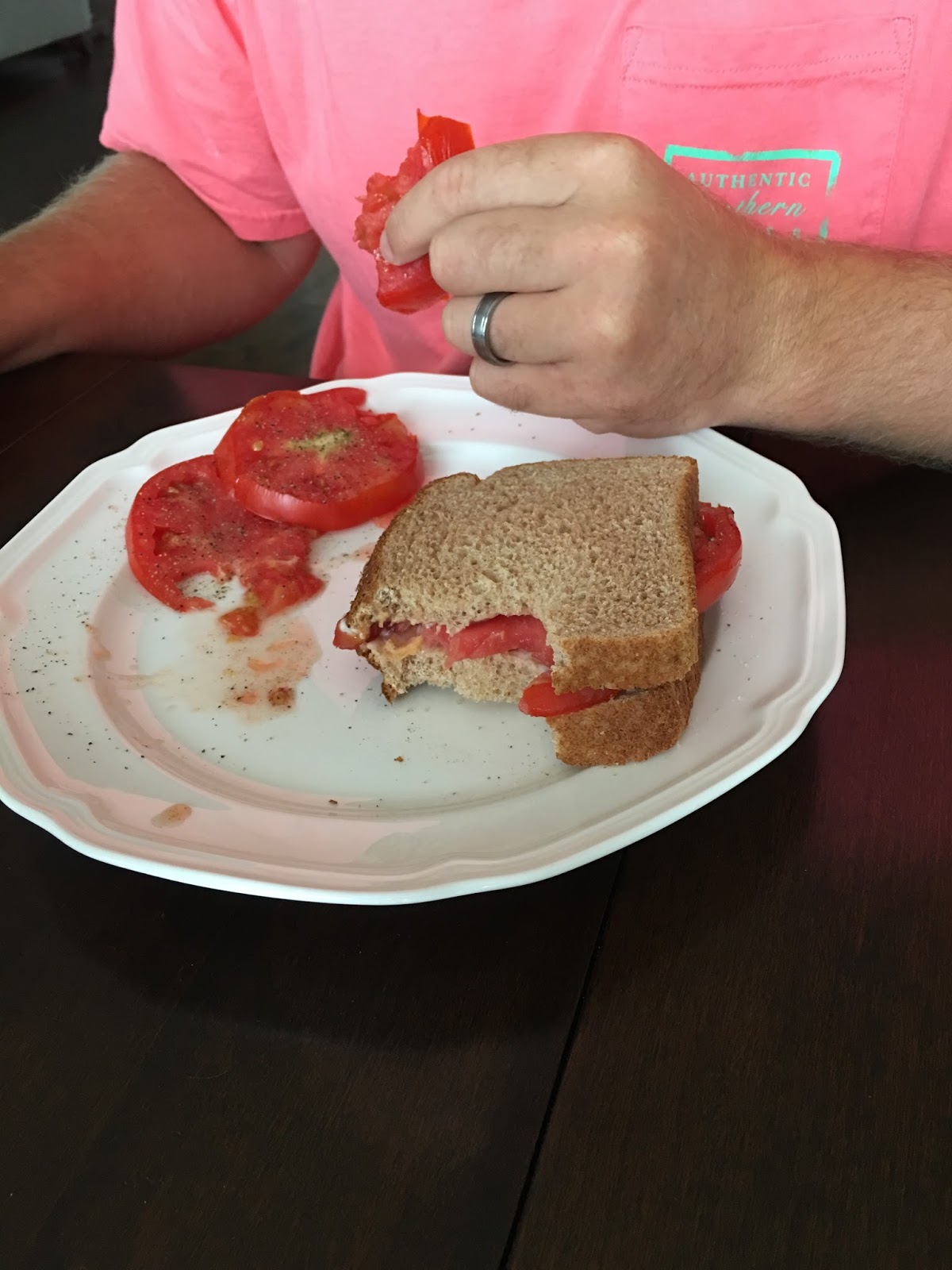 Summer means it’s tomato sandwich season! Except one of us (who won’t be named) likes to eat them for breakfast and the other person likes to eat them for lunch or dinner. I’m thankful my in-laws have a huge garden because it’s fresh veggies all the time right now!
