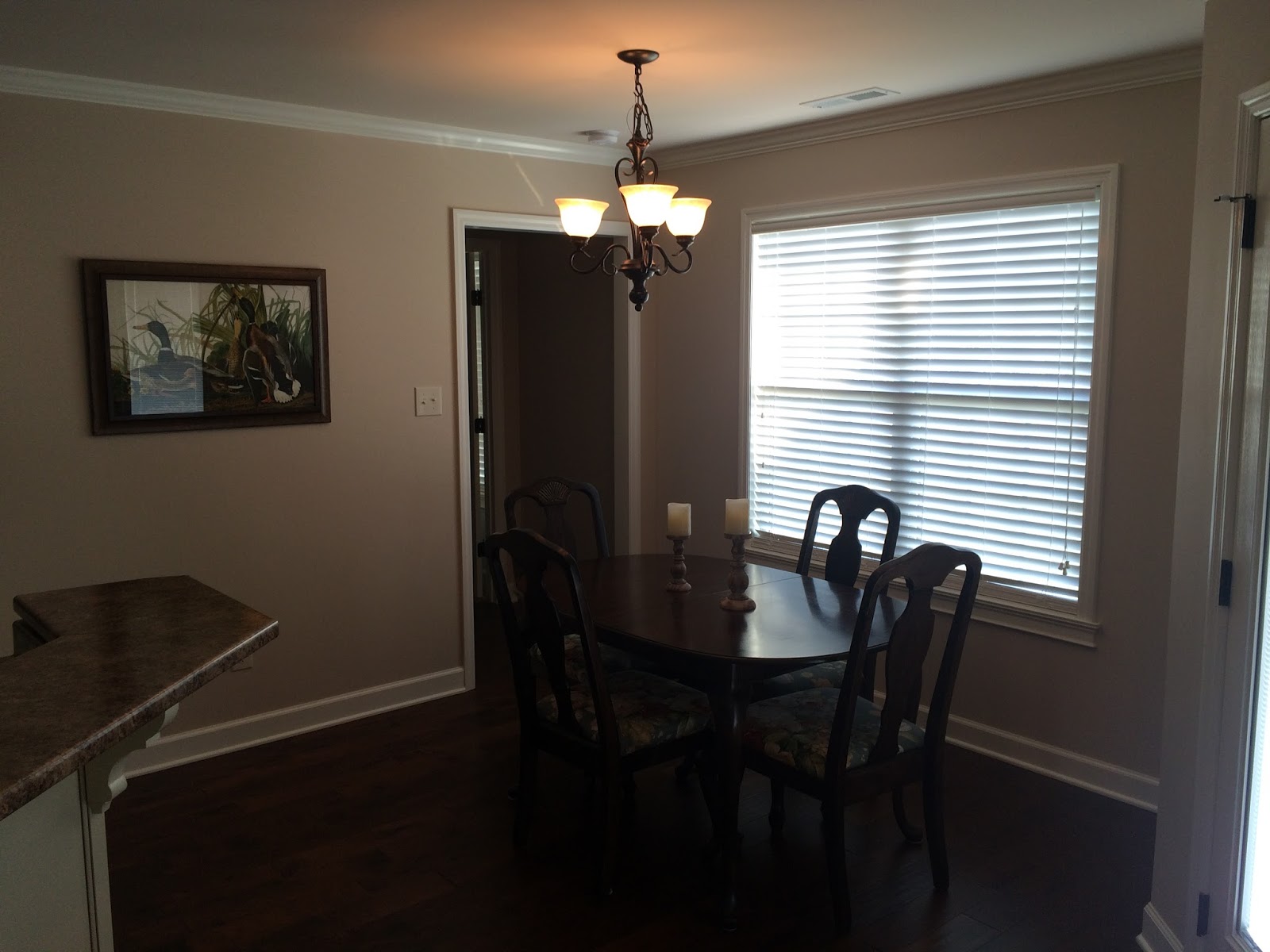 I used the same curtains from the living room in the breakfast room since the house is an open-concept floor plan and I wanted things to flow. I also added a picture–a cow picture from my mom and I had framed.