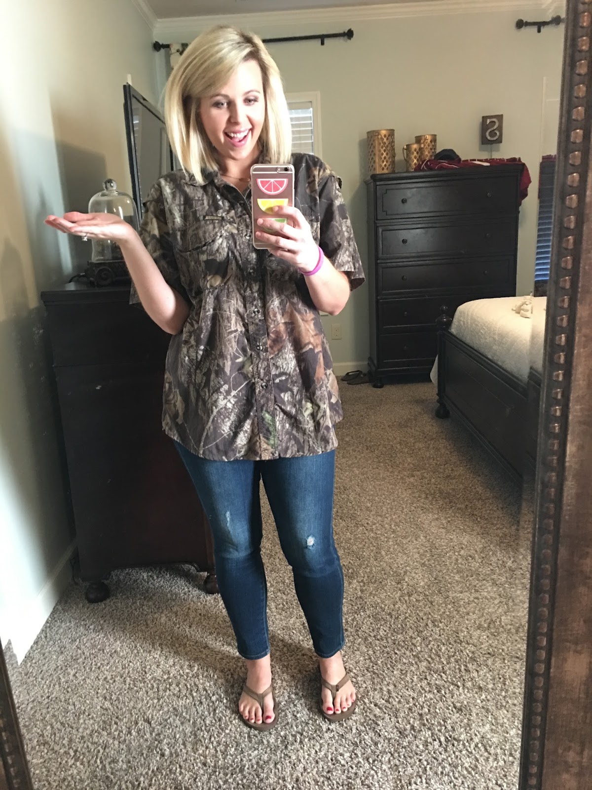 Yesterday was camo day at school–don’t I look so natural in camo haha! I had one little girl ask me if I really hunted and another if that was my husband’s shirt. I must have looked unnatural in camo ๐ (I also need a new iPhone cover…mine is summery, and Dustin needs to hang up his shirts that he laid on his chest. Things I noticed ha!)