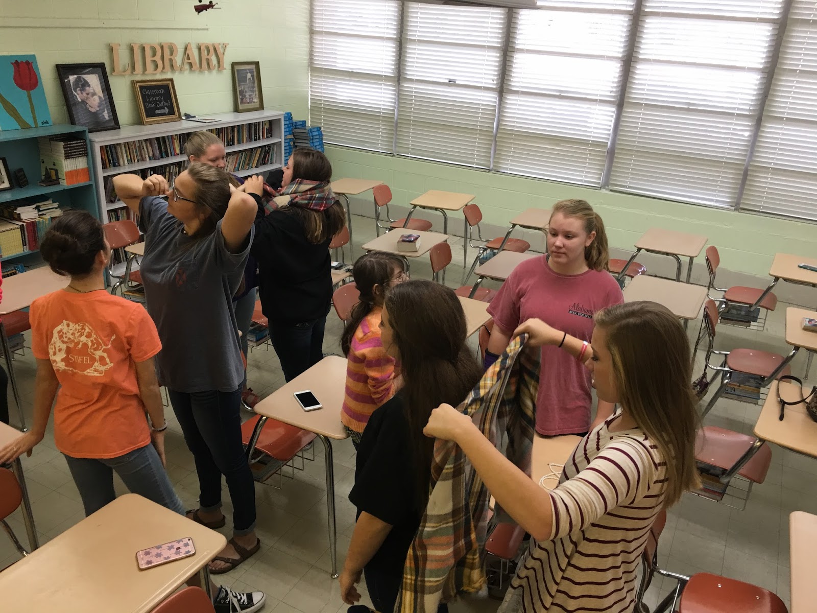 Each teacher in my school sponsors a club that meets on specific days throughout the school year.  This year my mom gave me the idea of doing a fashion club since I love clothing and fashion.  Our first club day was also the day of state volleyball games, so I had half of my girls out.  But this is a picture of some of the girls practicing different ways to wear a blanket scarf.  I had a blast our first meeting and I hope the girls did, too!
