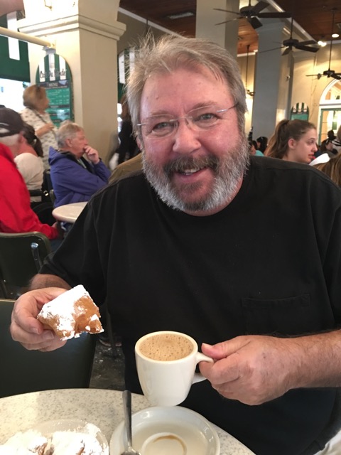 Dad enjoying his first cafe au lait and beignets