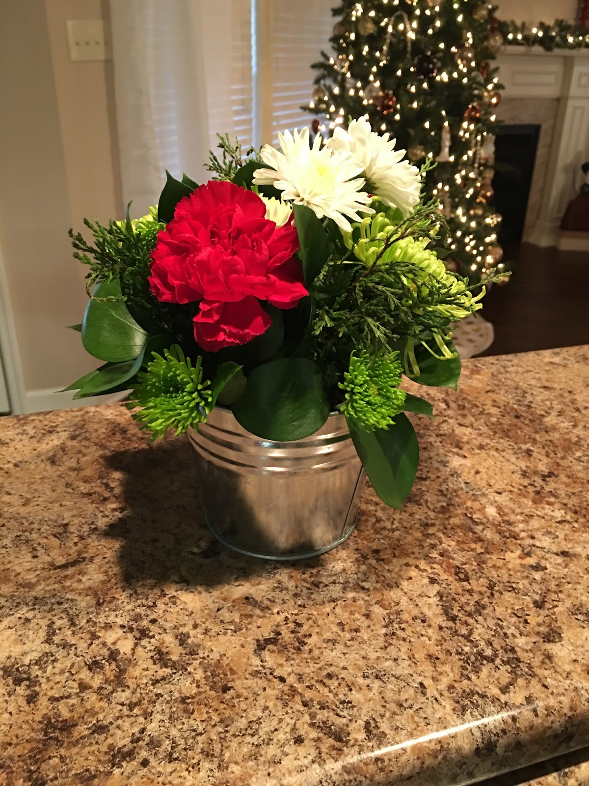 My view while doing dishes–I have a Woodwick candle burning next to my Christmas soap; a gorgeous bouquet of flowers a sweet friend gave me Friday, and a themed plate from Target to look at while looking at the tree…or listening to Christmas music ๐
