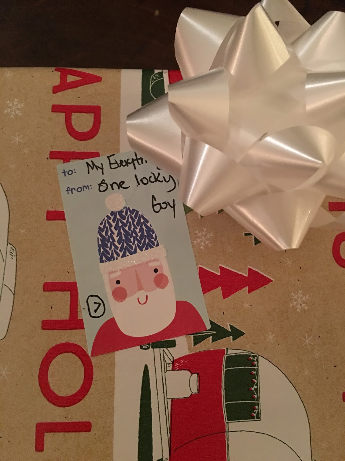 I had to snap a picture of this gift tag! Notice the number 7 circled–D puts numbers on my presents in the order that I am supposed to open them haha!