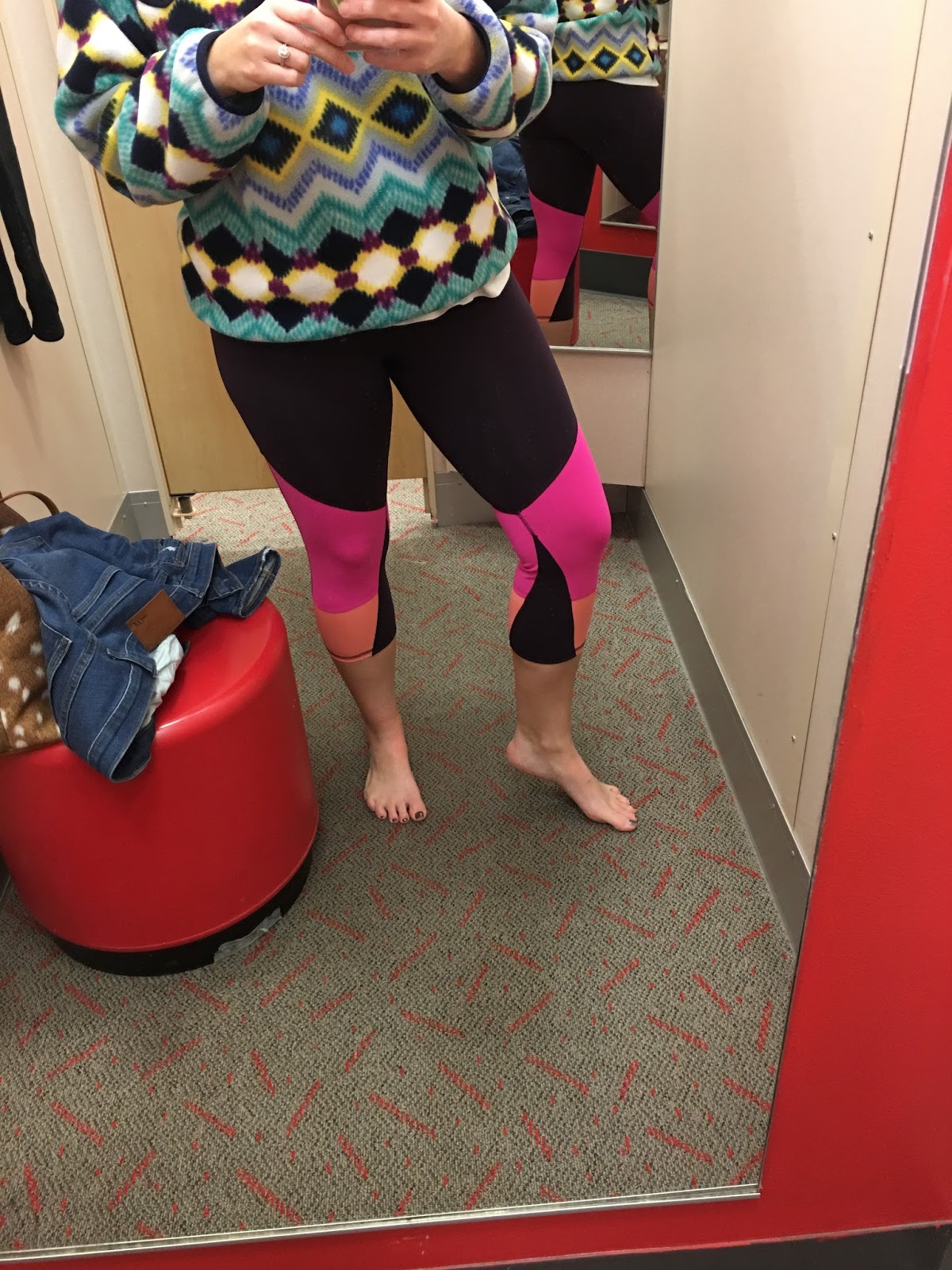 I ran by Target the other day to pick up some leggings that I could wear while doing weights in the weight room at the gym. I’m pretty picky about what I work out in–as in, I don’t want to get too hot. I found two pairs that had mesh ventilation to make it a little cooler.