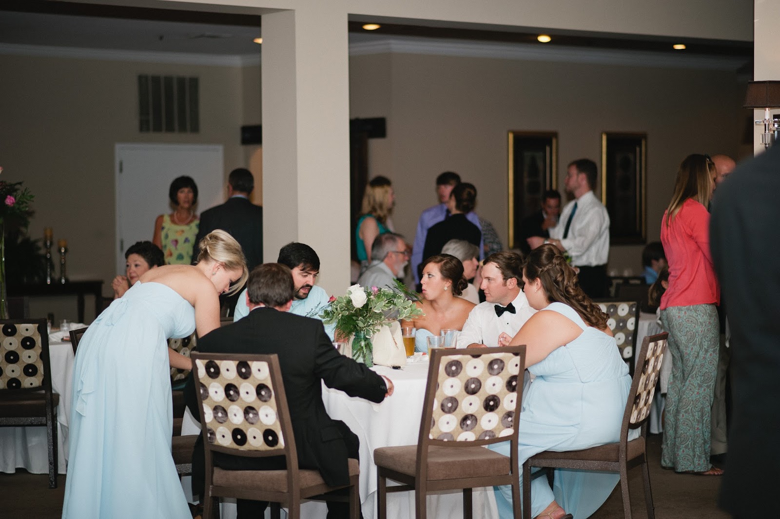 As soon as guests began arriving, they immediately picked up their food (yummy bbq) and began to eat. (Remember, we did get married at 6 PM and it was a 20 minute drive to the reception.) After pictures, Dustin and I had a table set up in the office and we were able to eat by ourselves before the actual reception began. Best thing we did! We were able to make sure we ate uninterrupted and it was so fun to recap the day together and eat our first meal as husband and wife.