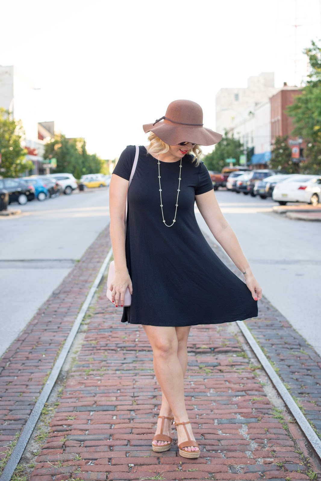 Enter the outfit above. The black swing dress, wedges, and necklace are perfect for teaching during the day. (Remember I told y’all that those wedges are my new favorite and the most comfortable wedges I’ve ever owned…for real) But if I am heading out to dinner that evening with some friends or teachers from school, I can throw on a cute hat and red lipstick to dress up my outfit from day to night.