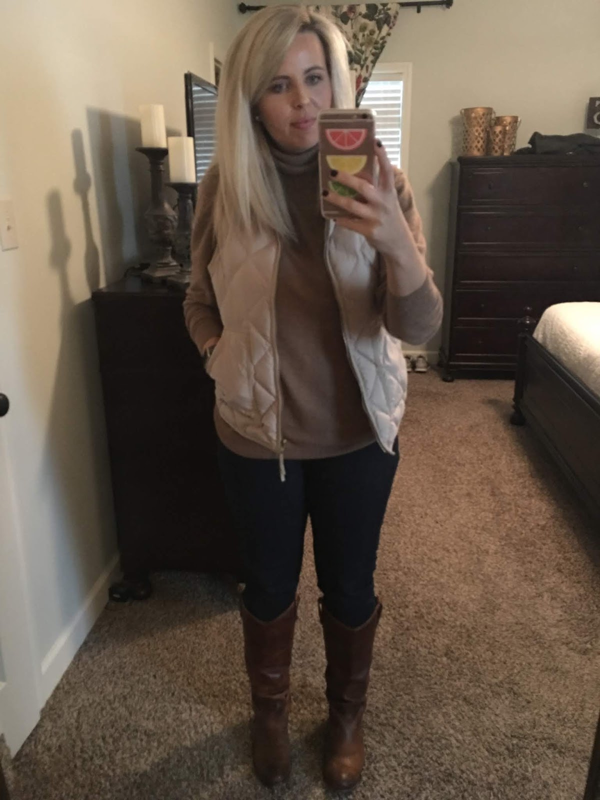 I was feeling the Sloan Ranger look on a cold Friday. It was easy to pair a turtleneck sweater, puffer vest, jeans, and riding boots.