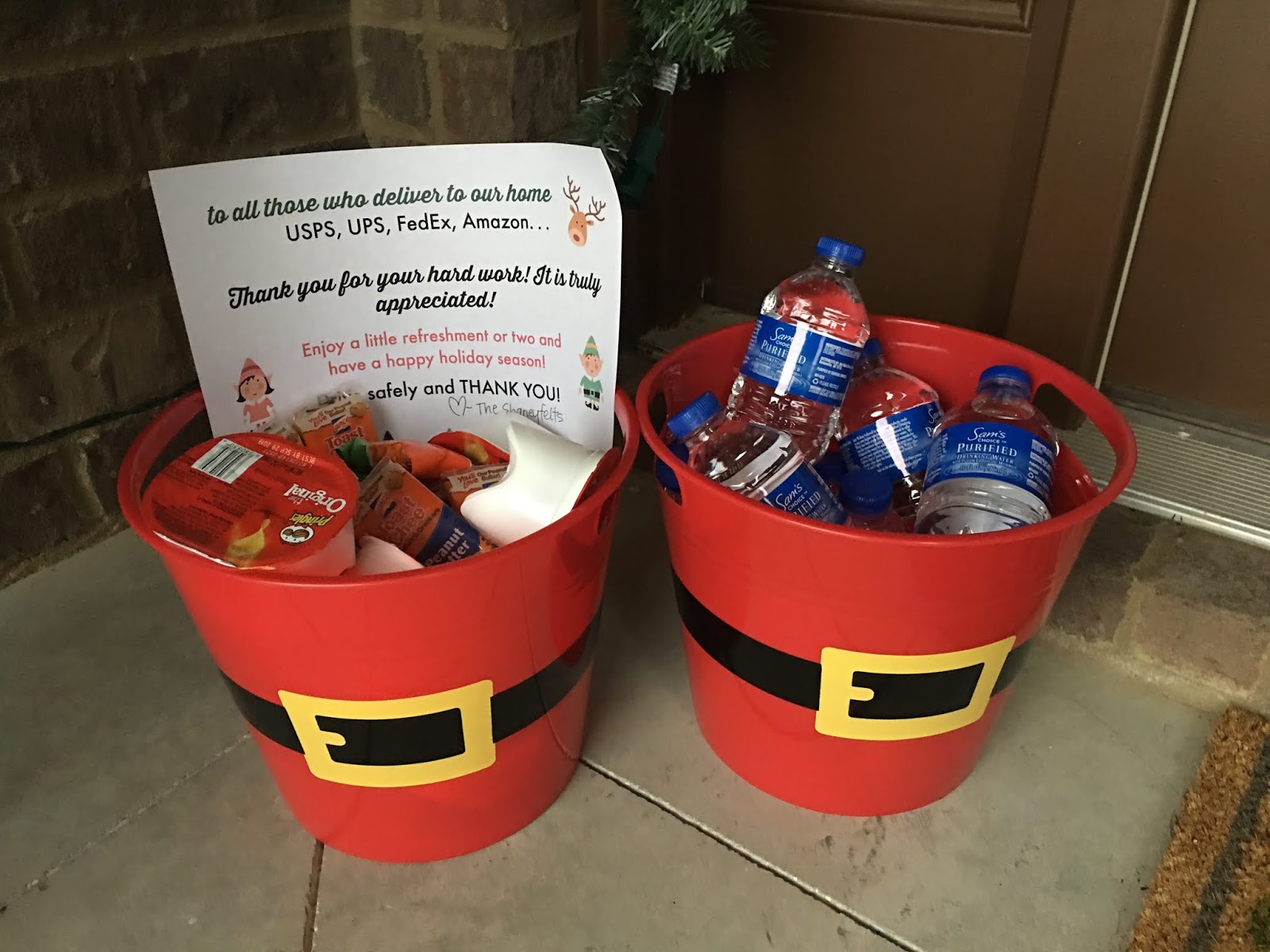 Because I did a good bit of our shopping online this year for Christmas presents, I decided to set out goodies for our delivery people this Christmas season. I grabbed those two buckets at Dollar General and filled one with mini waters and the other with small, individually wrapped snacks. I used mini pringles, an assortment of packs of crackers, and Reese trees. I also found that printable on Pinterest and just signed our last name at the bottom!