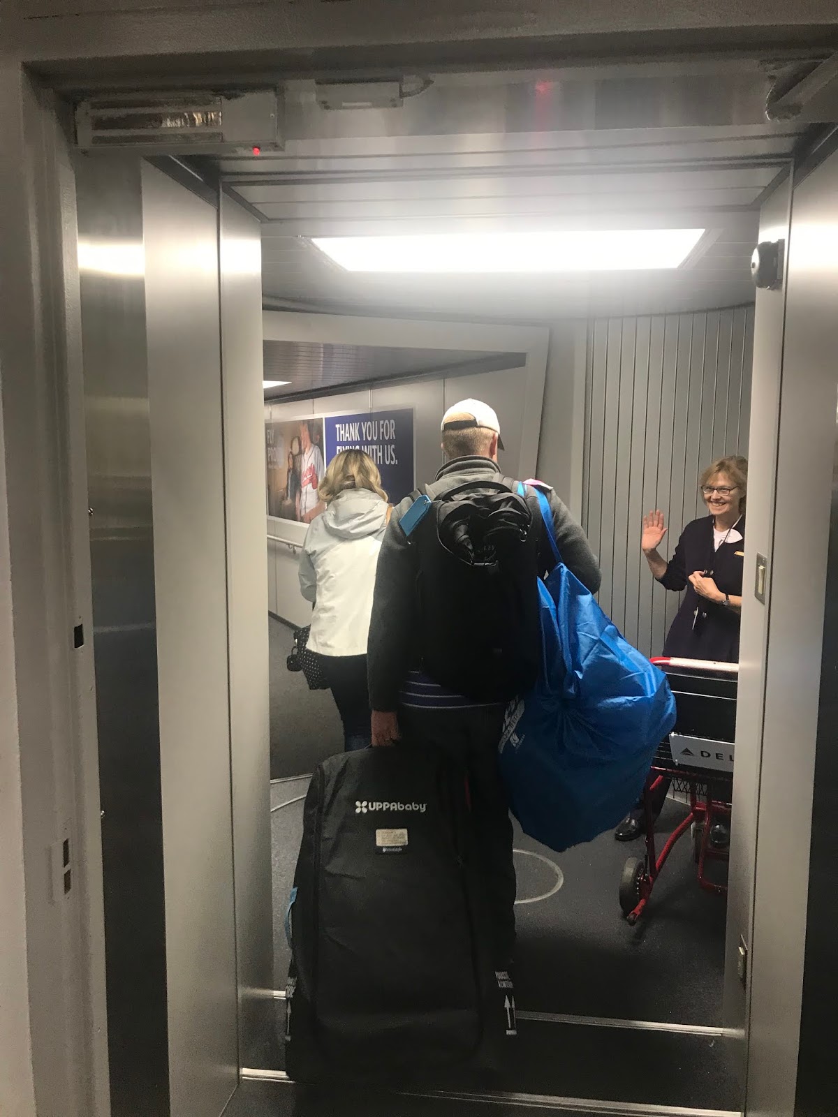 At our gate ready to leave for our connecting flight to ATL! This was everything we carried onto the plane ha! We gate checked the stroller and car seat. I had a carry on my purse and Dustin had a backpack and the diaper bag.