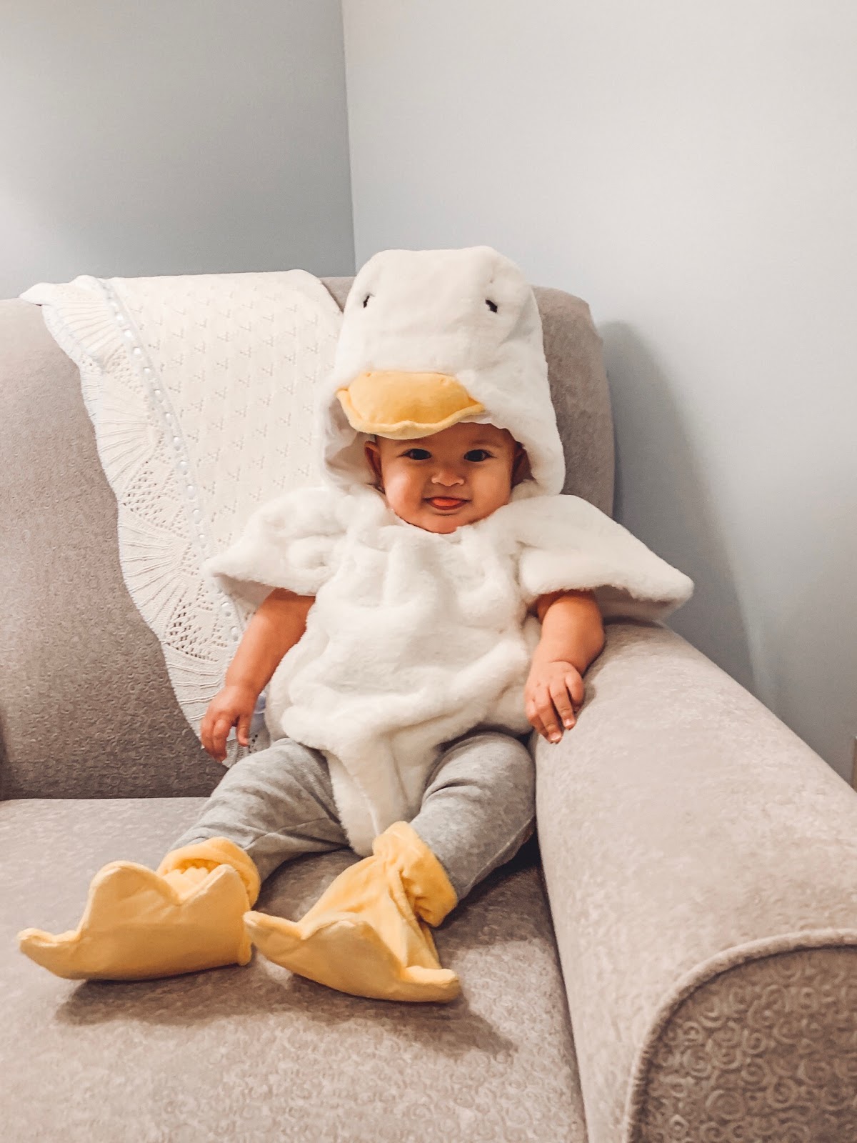 And then yesterday after I woke him from a nap (he was not happy about that), he was a baby duck! I’ve been dreaming of Pottery Barn Kids baby Halloween costumes for years, so I was thrilled to finally be able to buy one!