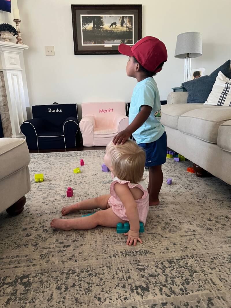 If I need about 15 minutes to get something done or to get things ready for us to get out the door, I can put on Toy Story and both babies are engrossed (Banks especially loves it!). I was trying to get everything together for us to get out the door and loaded in the car, and I had to snap this picture because Banks is so protective of Merritt. I’ve said this before, but when I found out I was pregnant with Merritt and that they were going to be so close together, I grieved the fact that Banks wouldn’t get to be the baby for very long. BUT a year later, I jokingly say Banks and Merritt are like having twins right now because they are best friends :). Their short age gap has been a gift I didn’t know we needed.