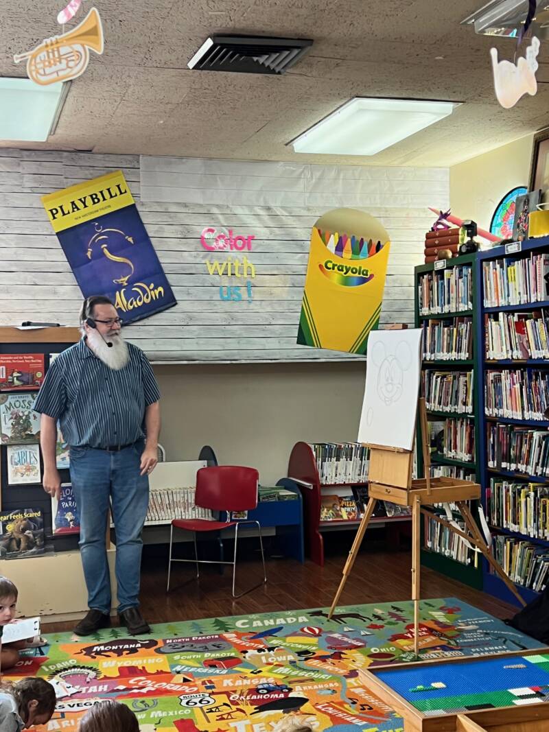 I know I’ve talked about this before, but our local public library is fantastic! We’re currently in the process of getting a new library built since the current building is an old bank, so our librarians do a fantastic job with the space they have. Every Thursday is the Summer Reading Program day, and this year the theme has been Color Your World. This past Thursday was an art day. All of the kids received a clipboard, paper, and pencil, and a former Disney imagineer taught the kids how to draw Mickey Mouse! Harrison had a great time and for a 6 year old, his drawing was pretty impressive.