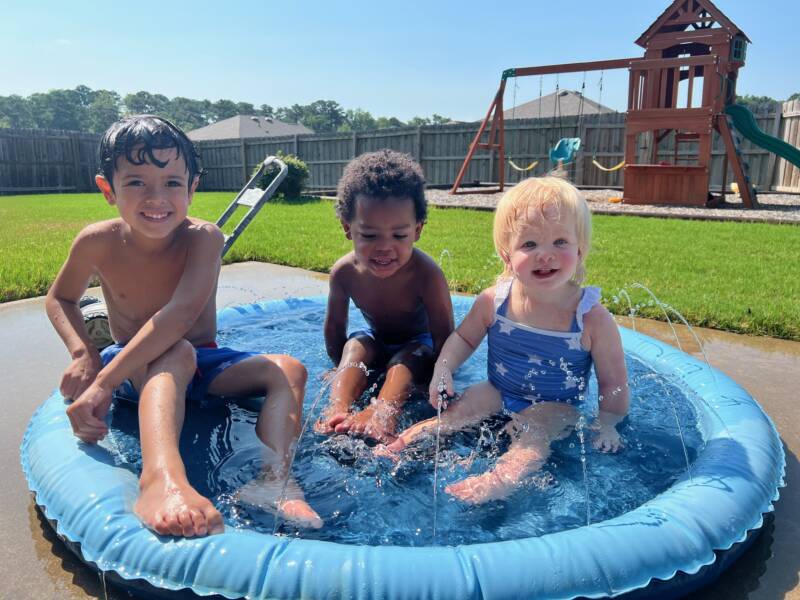 I know I’ve shared a picture of them in their matching bathing suits each week, but it’s something we’ve done weekly! And this summer, I knew we wouldn’t be going swimming (there’s no way I could take all 3 by myself right now with Banks and Merritt being so young) so I only bought them one bathing suit! We’ve definitely gotten our money out of it haha!