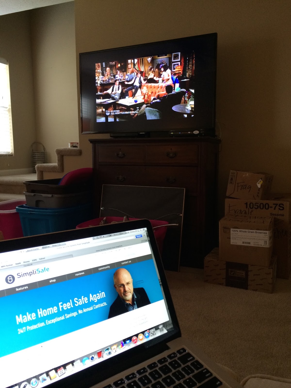 Dustin left for work at 4:15 PM and I finished reading my chapter in the Spiritual Disciplines book. I took a quick break to look up home security system options while watching Friends in the background. Can you see the boxes in the background? They are everywhere.