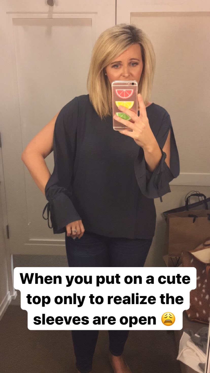 Mom grabbed me this top to try on in Loft. It was so cute….until I put it on. I don’t like open sleeves or cold shoulder tops because they are too trendy for me, so this shirt was a definite no. These types of tops look so cute on everyone I see, but they just aren’t for me.
