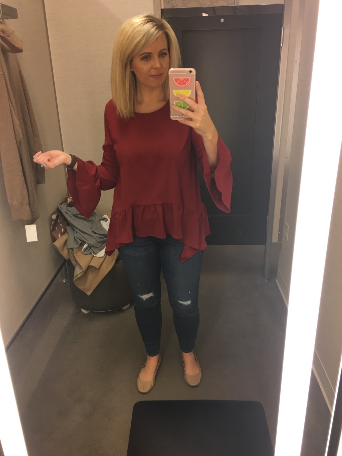 We went into Nordstrom and tried on a bunch of clothes. One of the tops that I loved but didn’t work for me was this ruffle hem top. It was full of so much static when I put it on that it was completely stuck to my body. I’ve seen a ton of bloggers wear this top and it’s so cute on, but I wish it were made out of a different material.