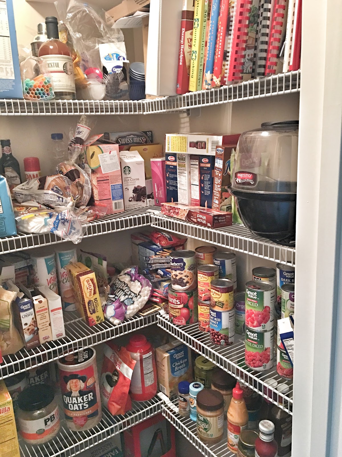 -Some items that I keep in stock are just for special occasions–cake mixes in case I need to quickly make a dessert, chex cereal for homemade chex mix or trail mix, etc.