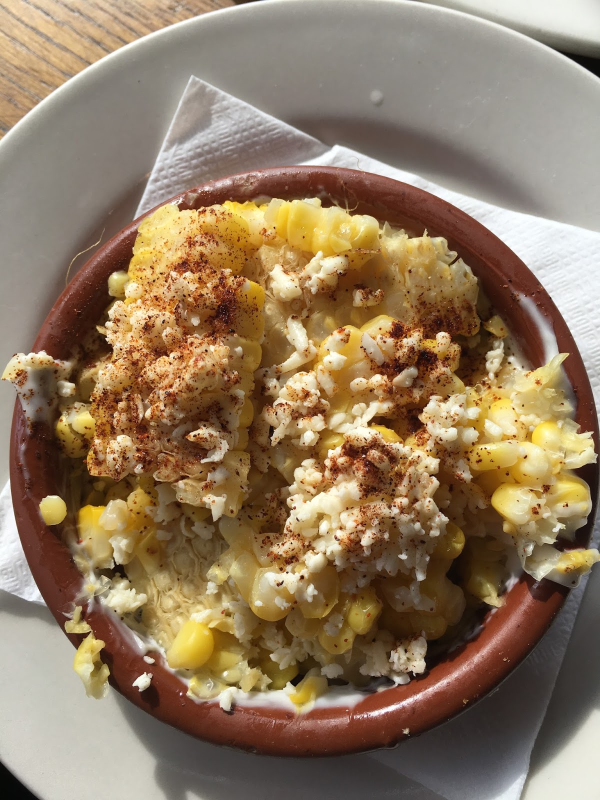 This is their corn called elote. This time I had them slice it off the cobb, but from now on I’ll just eat it off the cobb–so much easier. It’s got some sort of sauce on it, chili powder, and cojita cheese.