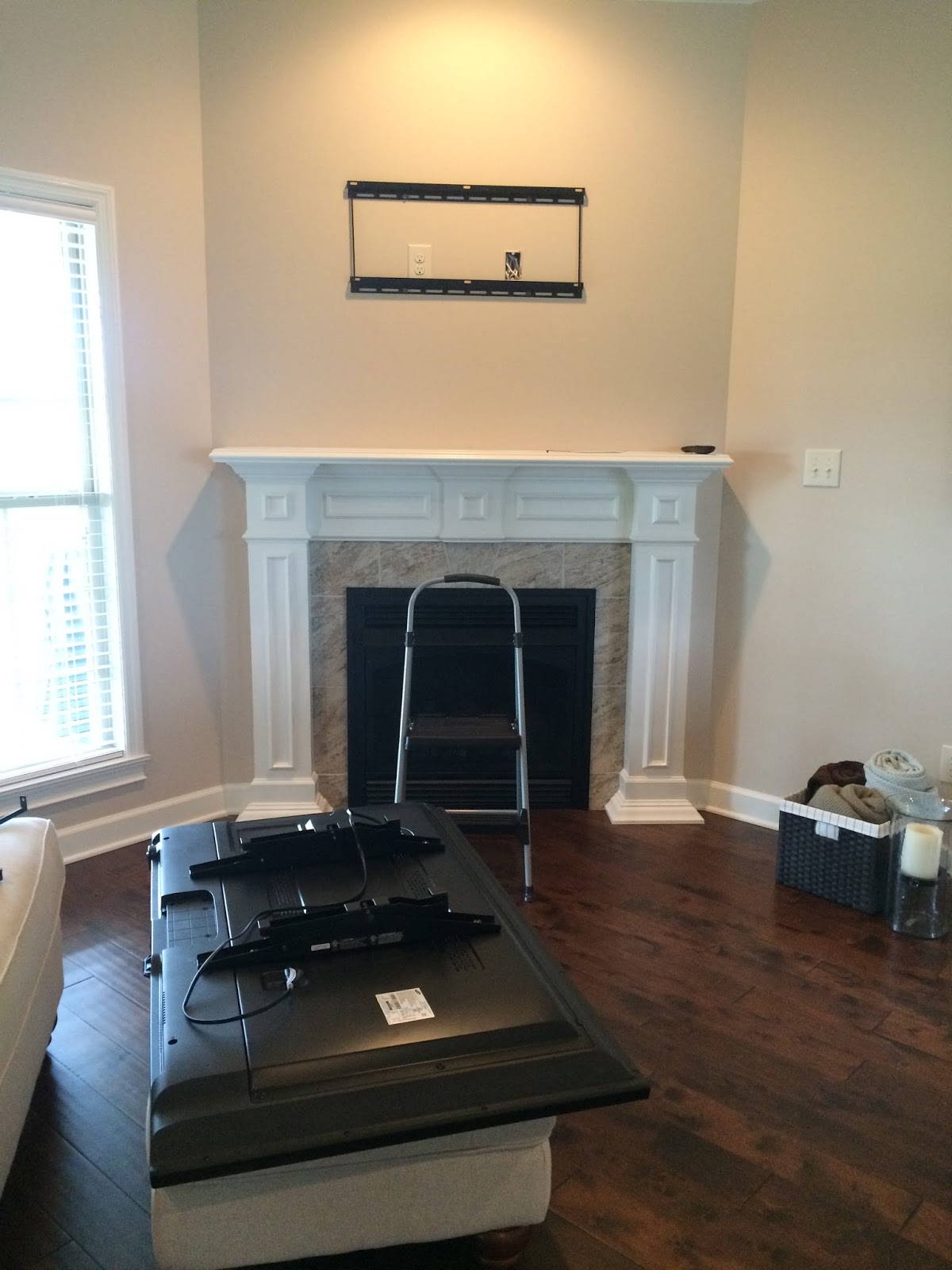 We worked on centering our TV…again. We mounted it a month ago when we moved in but it wasn’t centered. We left it because it was so much work mounting it. But with my sister having an AdvoCare mixer at my house yesterday, that spurred us on to centering it and hiding all of the cords.